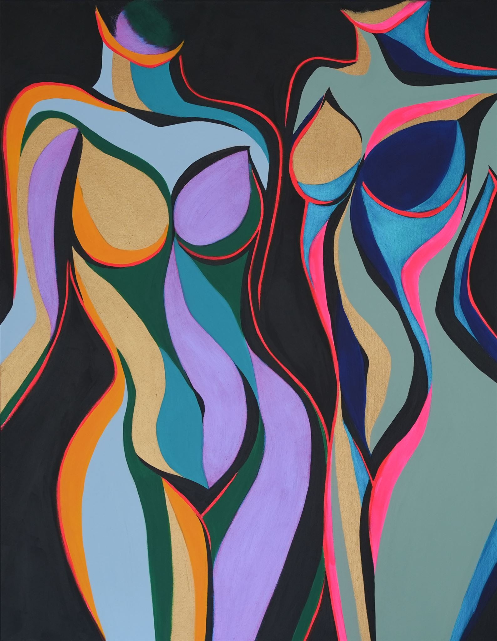 Jessica uses vivid, commanding colours that battle against shadowy backgrounds, symbolizing resilience and intensity,